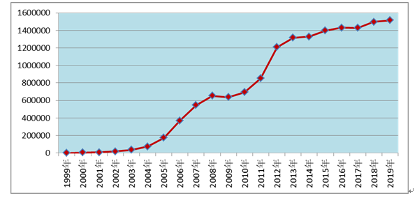 2019年全國藥品不良反應(yīng)監(jiān)測(cè)網(wǎng)絡(luò)收到《藥品不良反應(yīng)/事件報(bào)告表》151.4萬份。1999年至2019年,全國藥品不良反應(yīng)監(jiān)測(cè)網(wǎng)絡(luò)累計(jì)收到《藥品不良反應(yīng)/事件報(bào)告表》1,519萬份(圖1)。