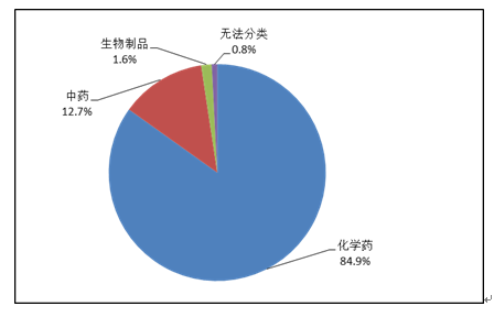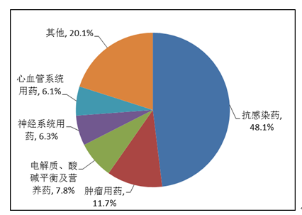按照藥品類別統(tǒng)計(jì),化學(xué)藥品占86.6%,中藥占12.6%,生物制品占0.8%。化學(xué)藥品排名居前的藥品類別是抗感染藥、心血管系統(tǒng)用藥、腫瘤用藥、神經(jīng)系統(tǒng)用藥、電解質(zhì)、酸堿平衡及營養(yǎng)藥;中藥排名居前的藥品類別是理血?jiǎng)?、補(bǔ)益劑、祛濕劑、開竅劑、清熱劑。
